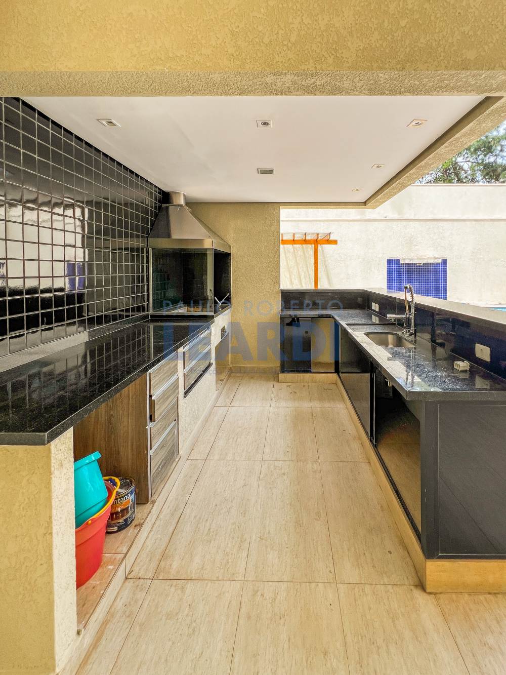 Cozinha moderna e funcional. Área externa com churrasqueira e piscina.