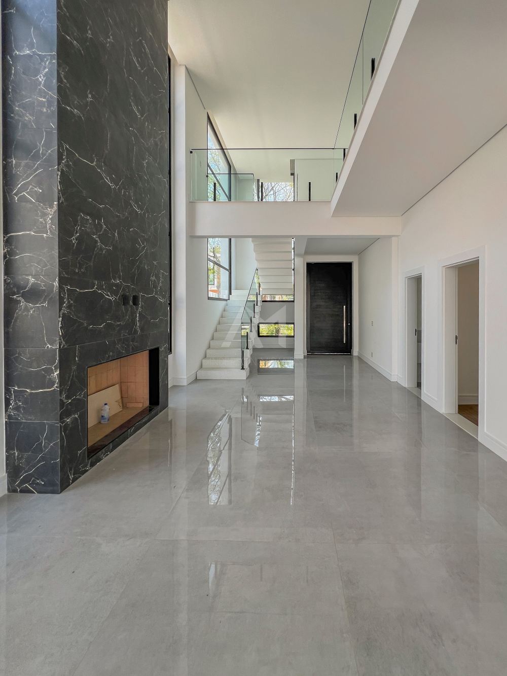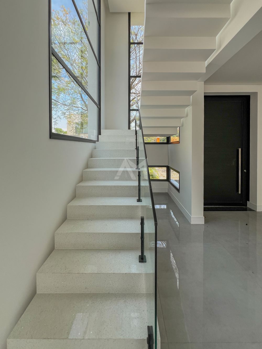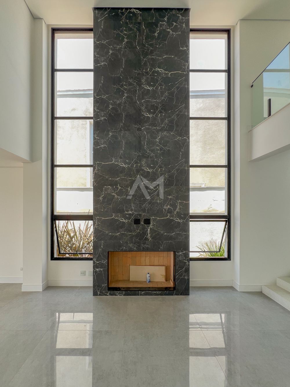 O pé direito duplo e as esquadrias automatizadas enriquecem o design. A casa está preparada para energia fotovoltaica e possui sistema de energia solar, alinhando luxo com sustentabilidade.