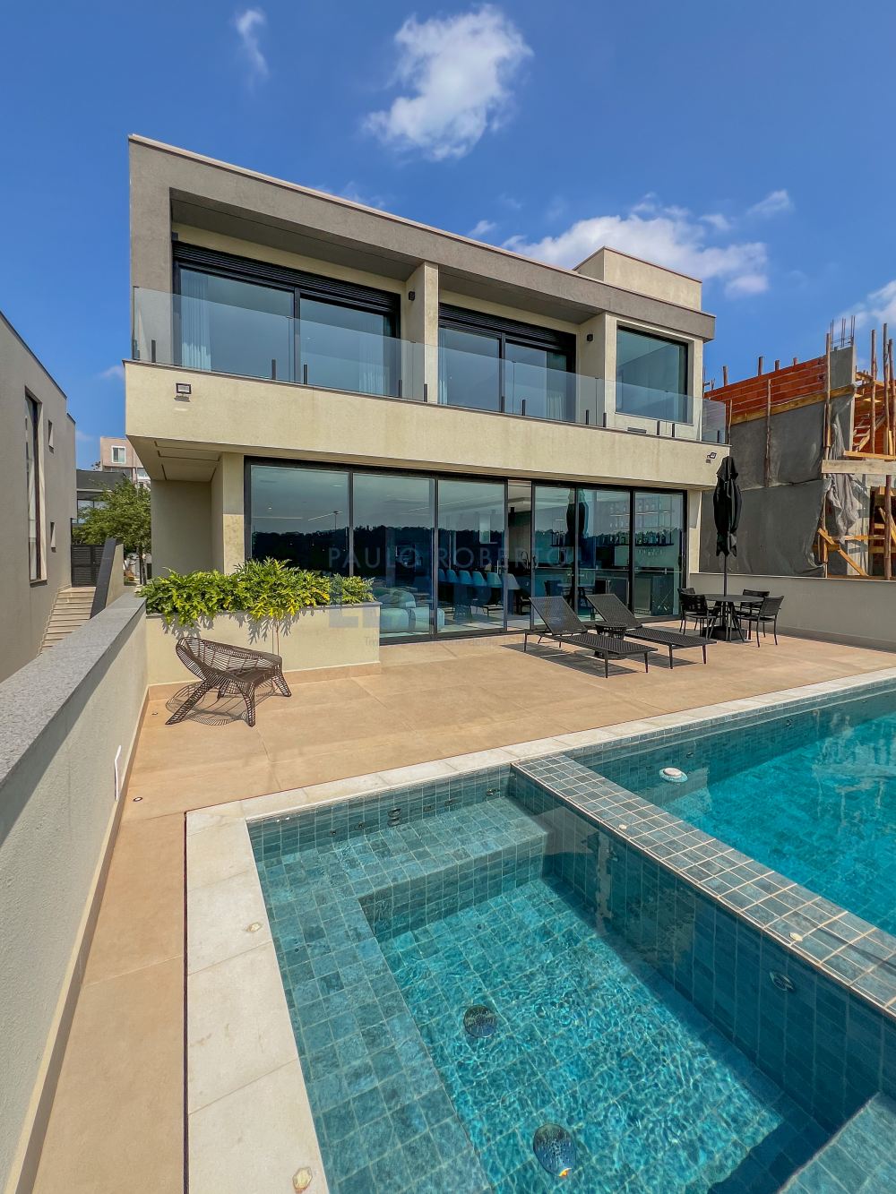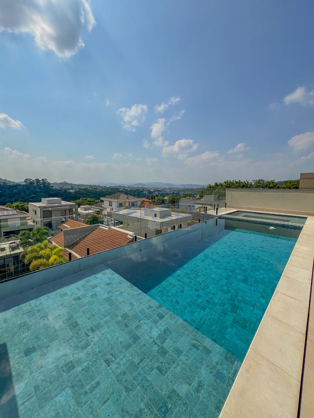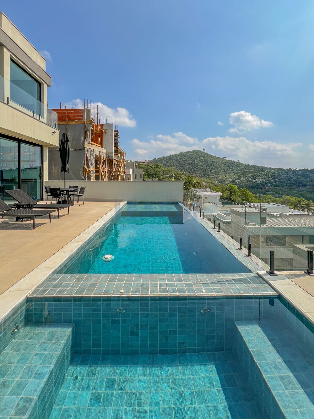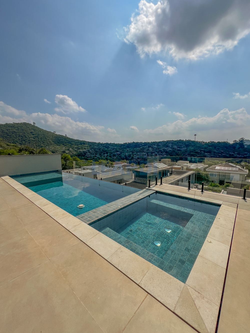 Piscina e spa com iluminação, aquecidos individualmente por trocador de calor de alta potência