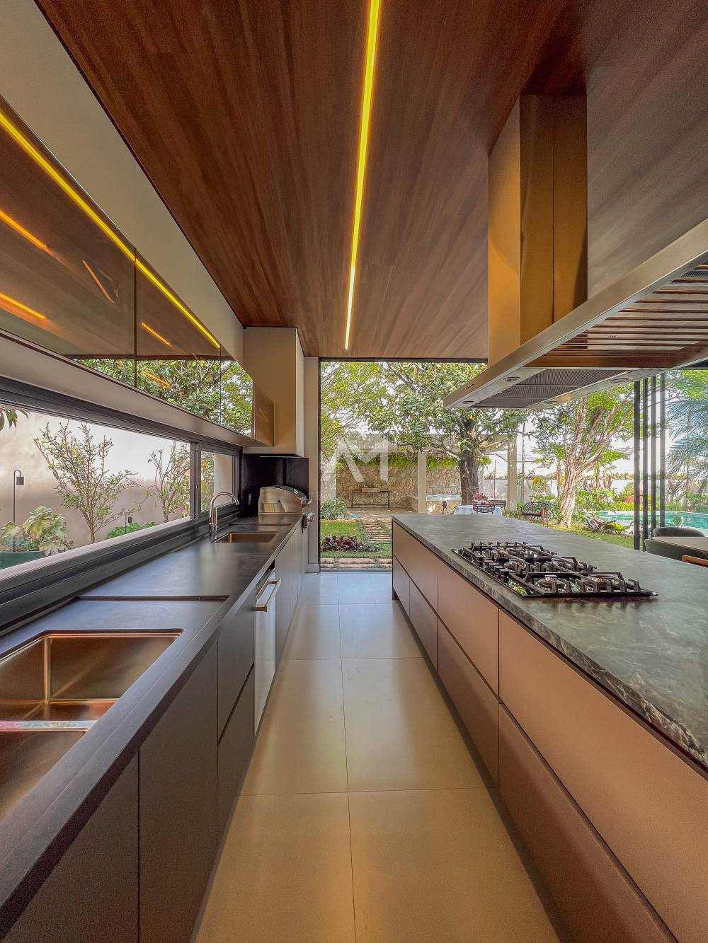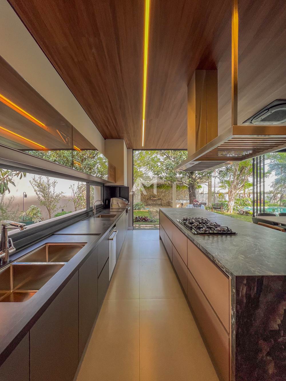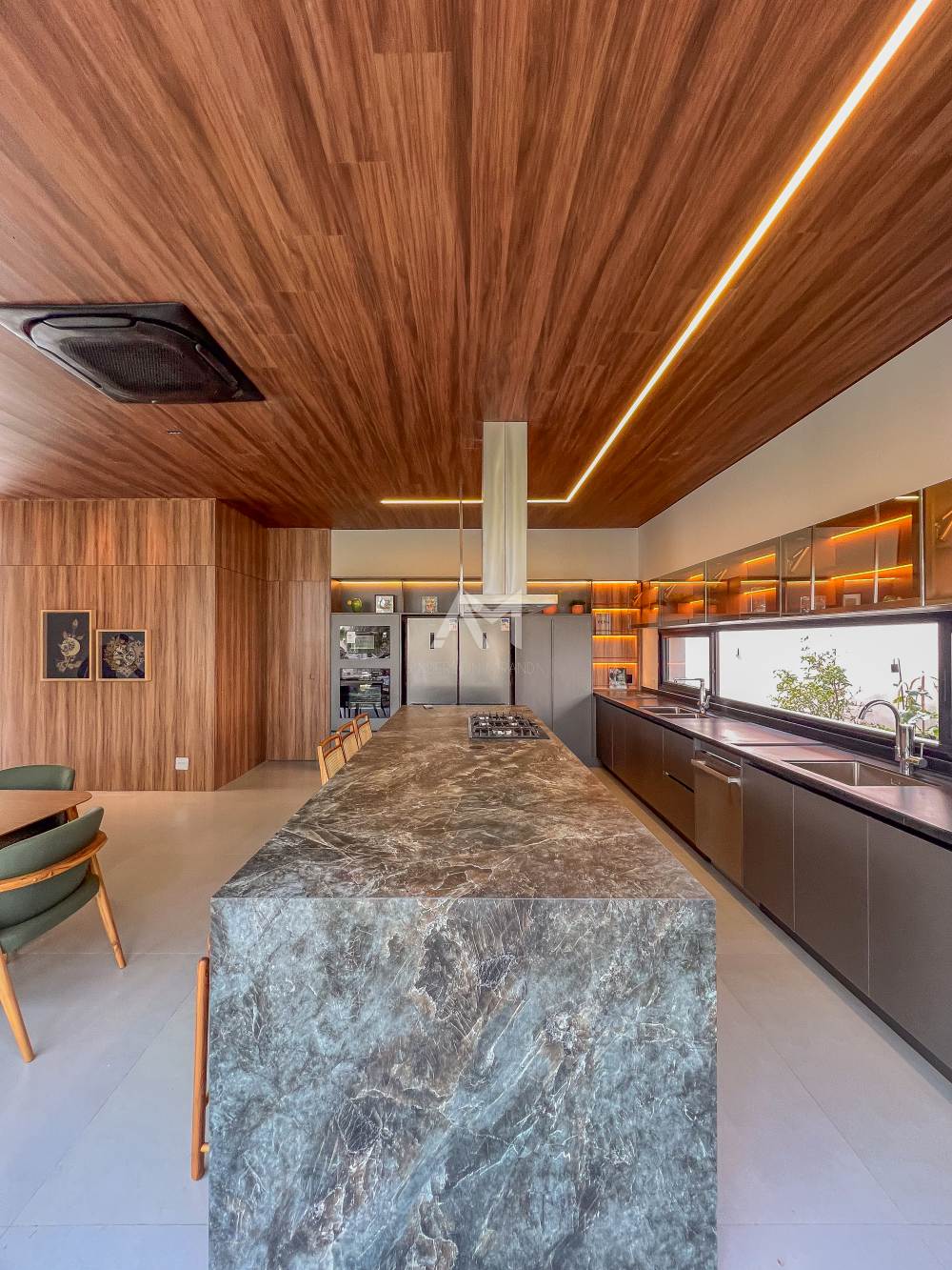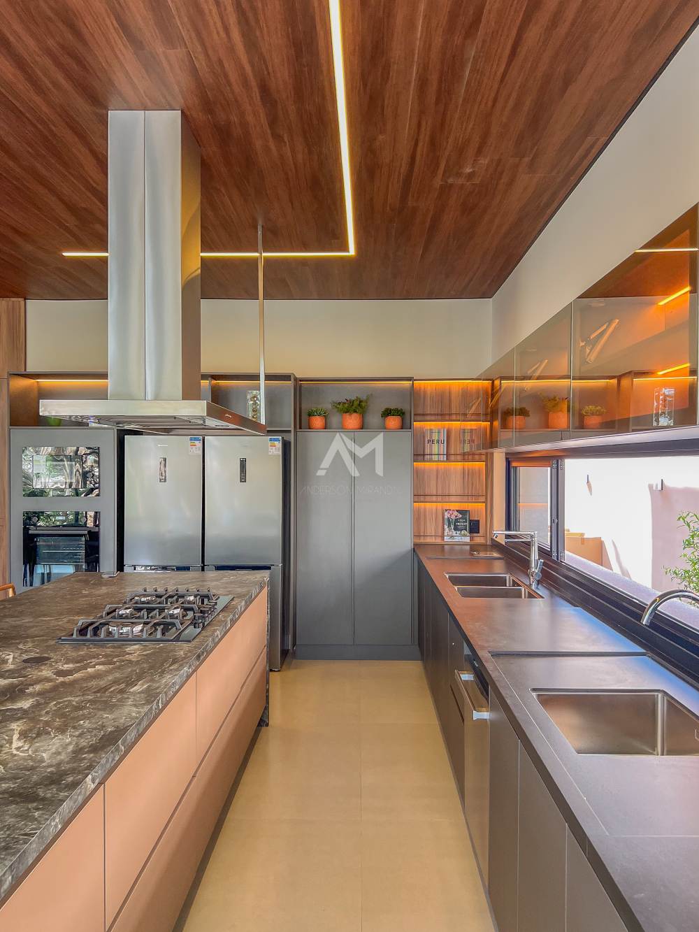Cozinha Gourmet planejada com ilha central em mármore, eletrodomésticos embutidos de alta qualidade e integração à area externa.