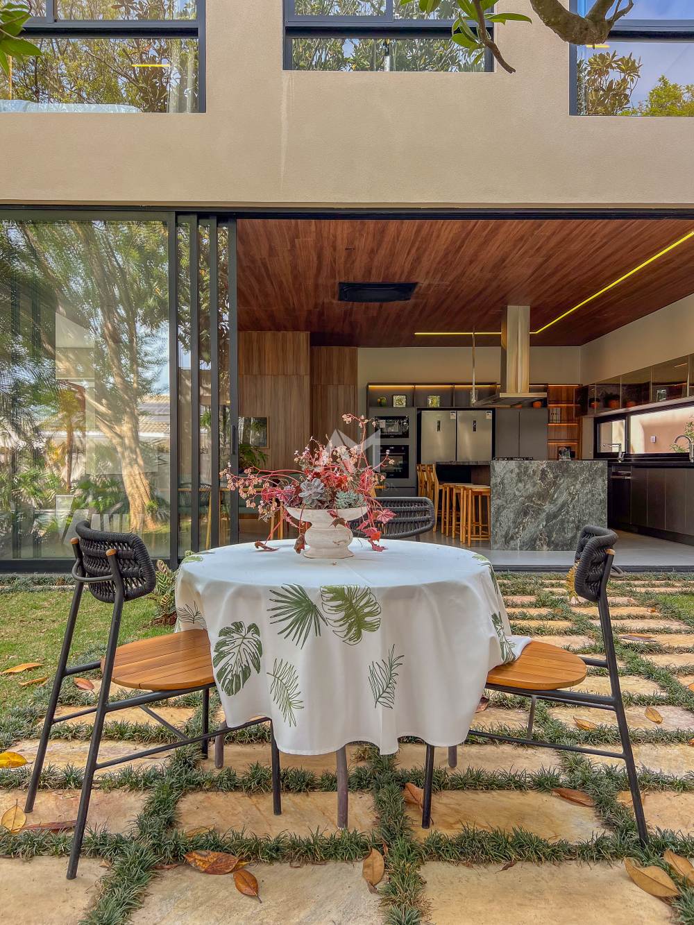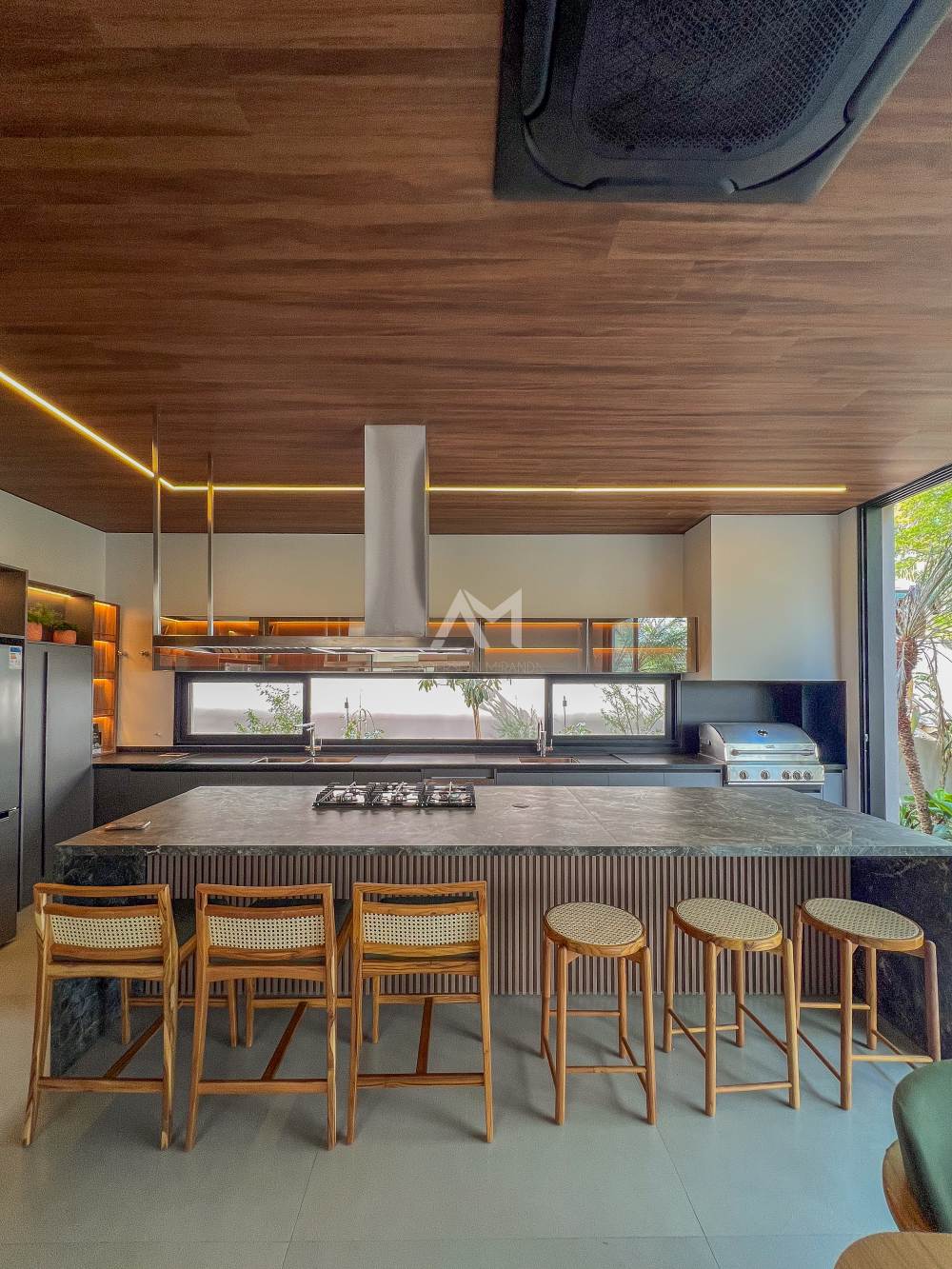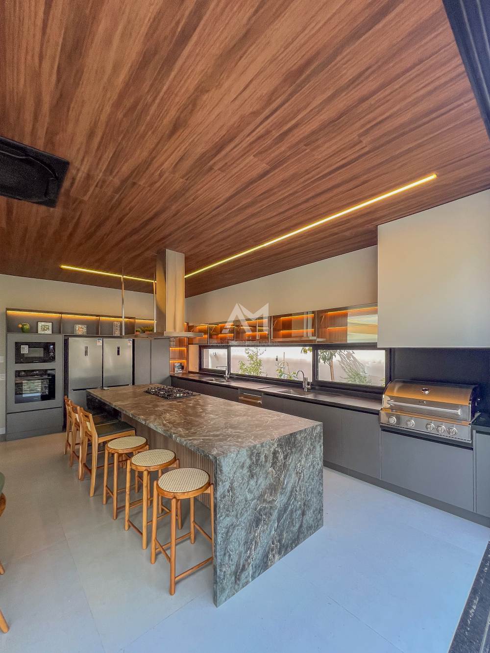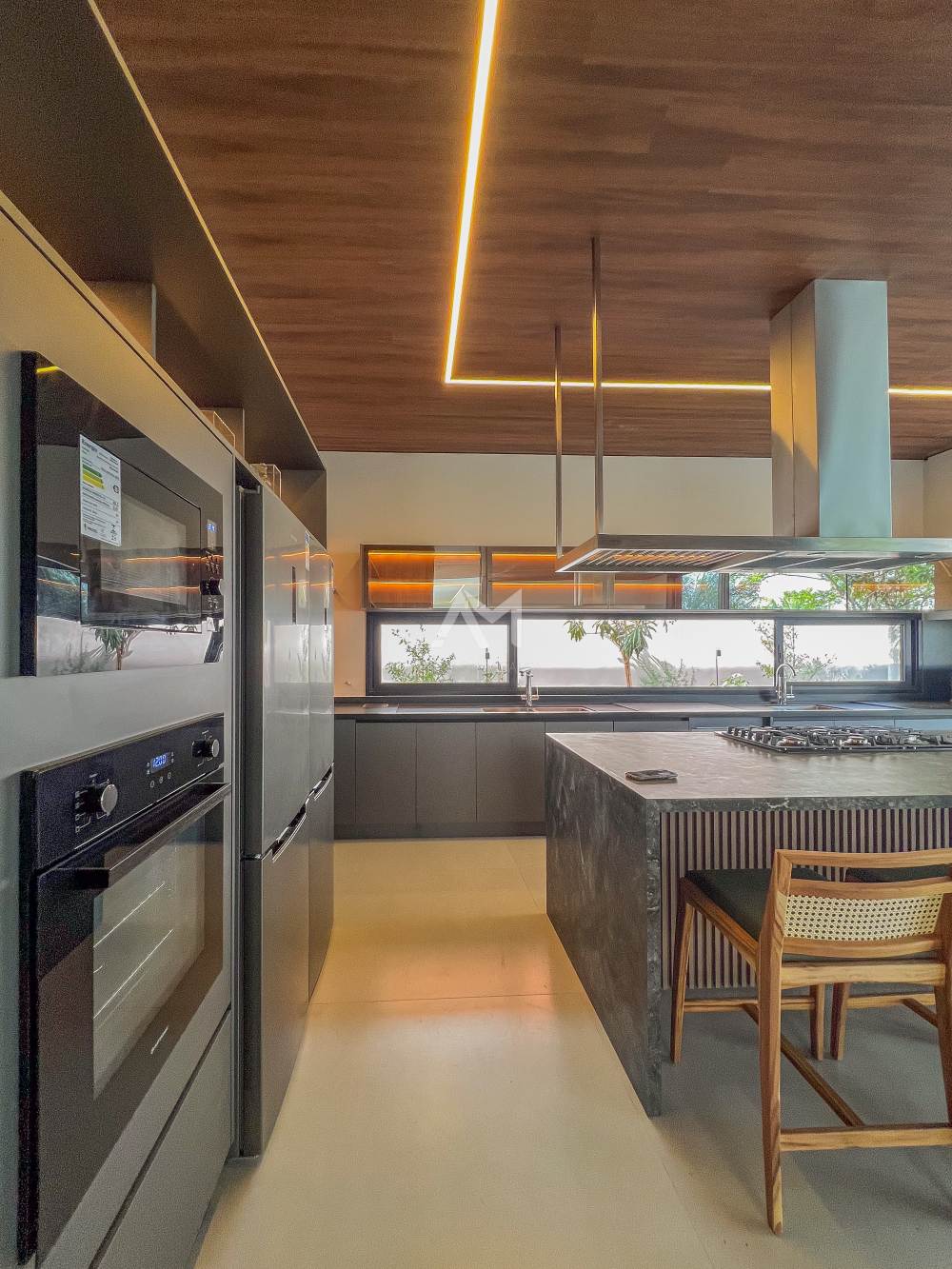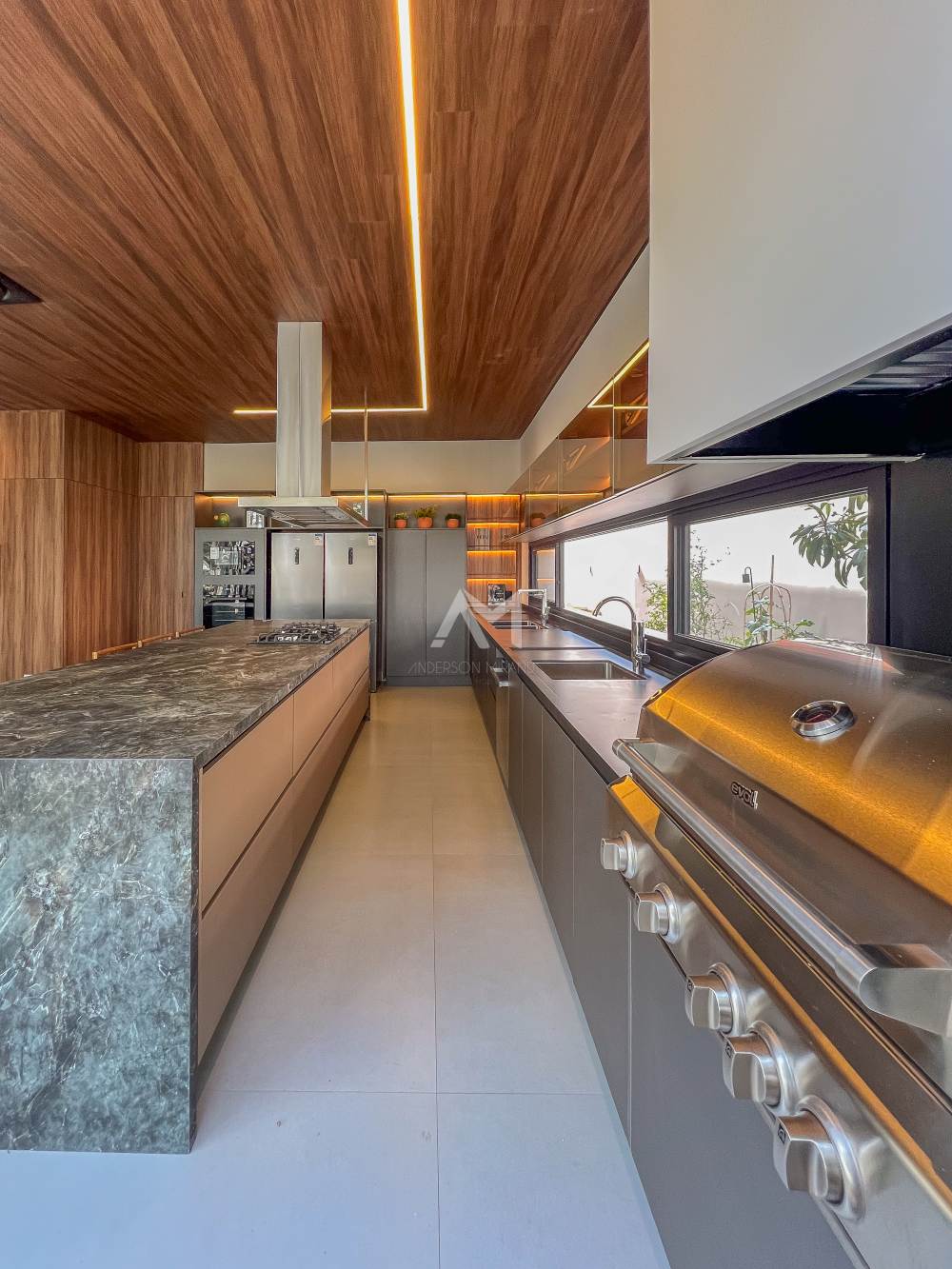 Cozinha Gourmet planejada com ilha central em mármore, eletrodomésticos embutidos de alta qualidade e integração à area externa.