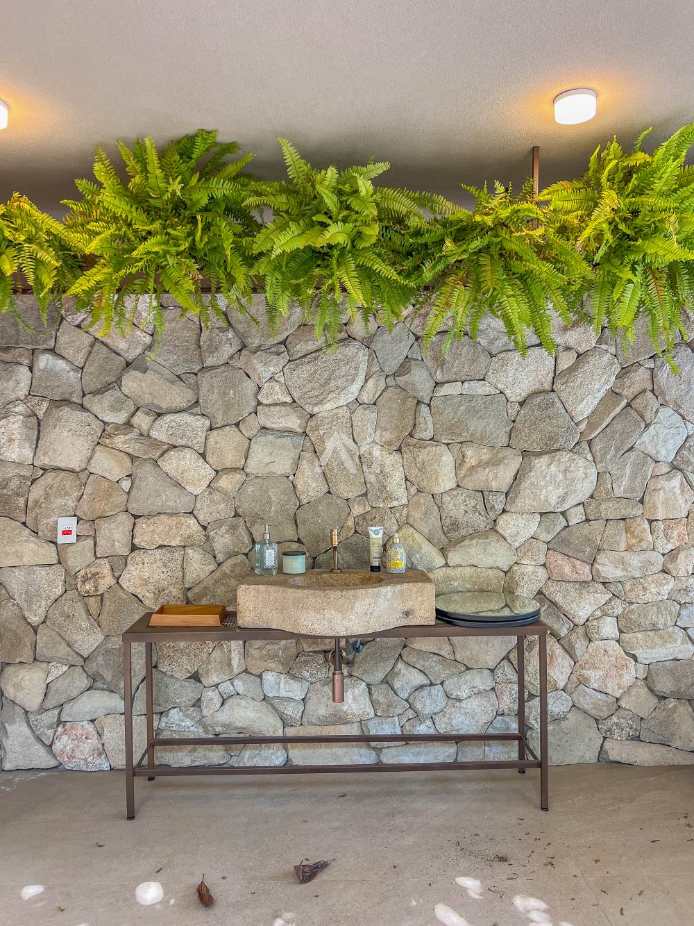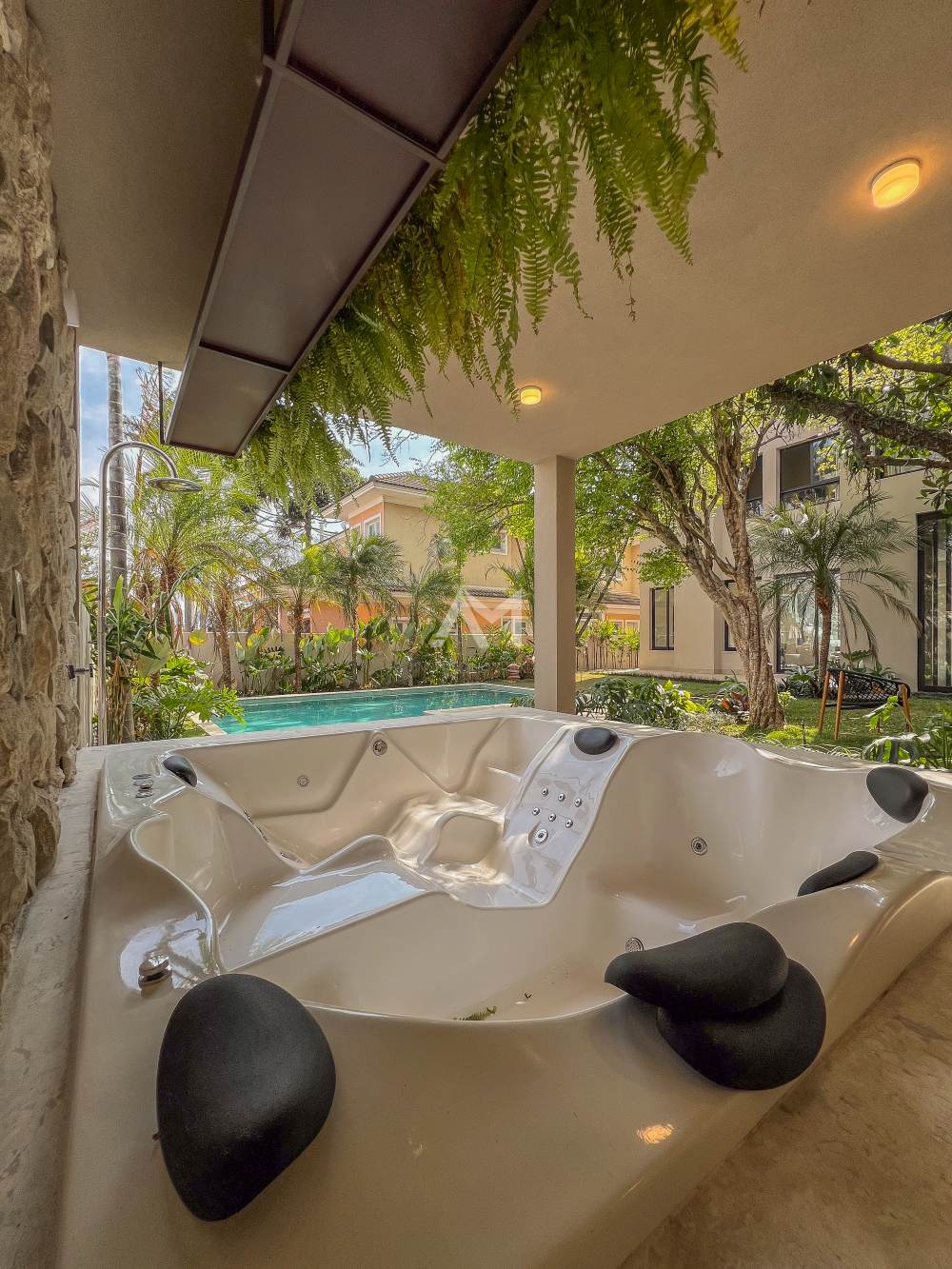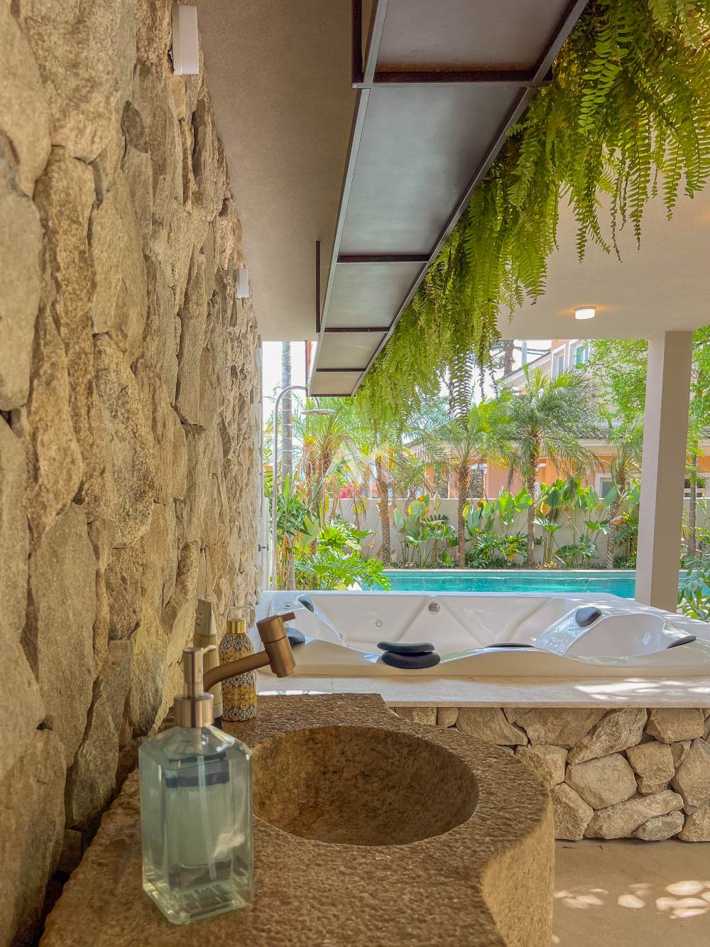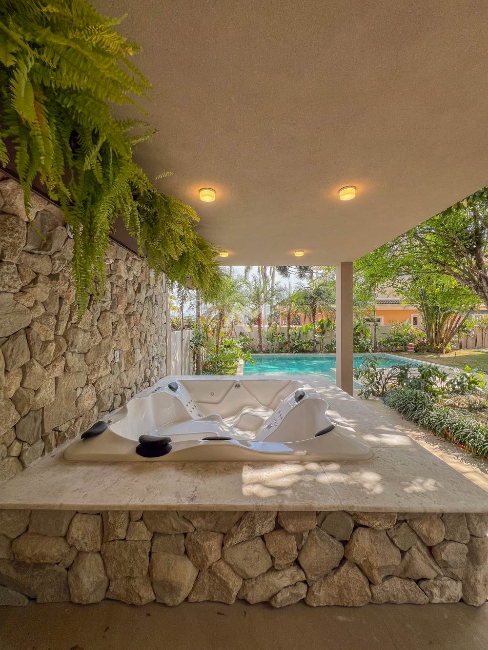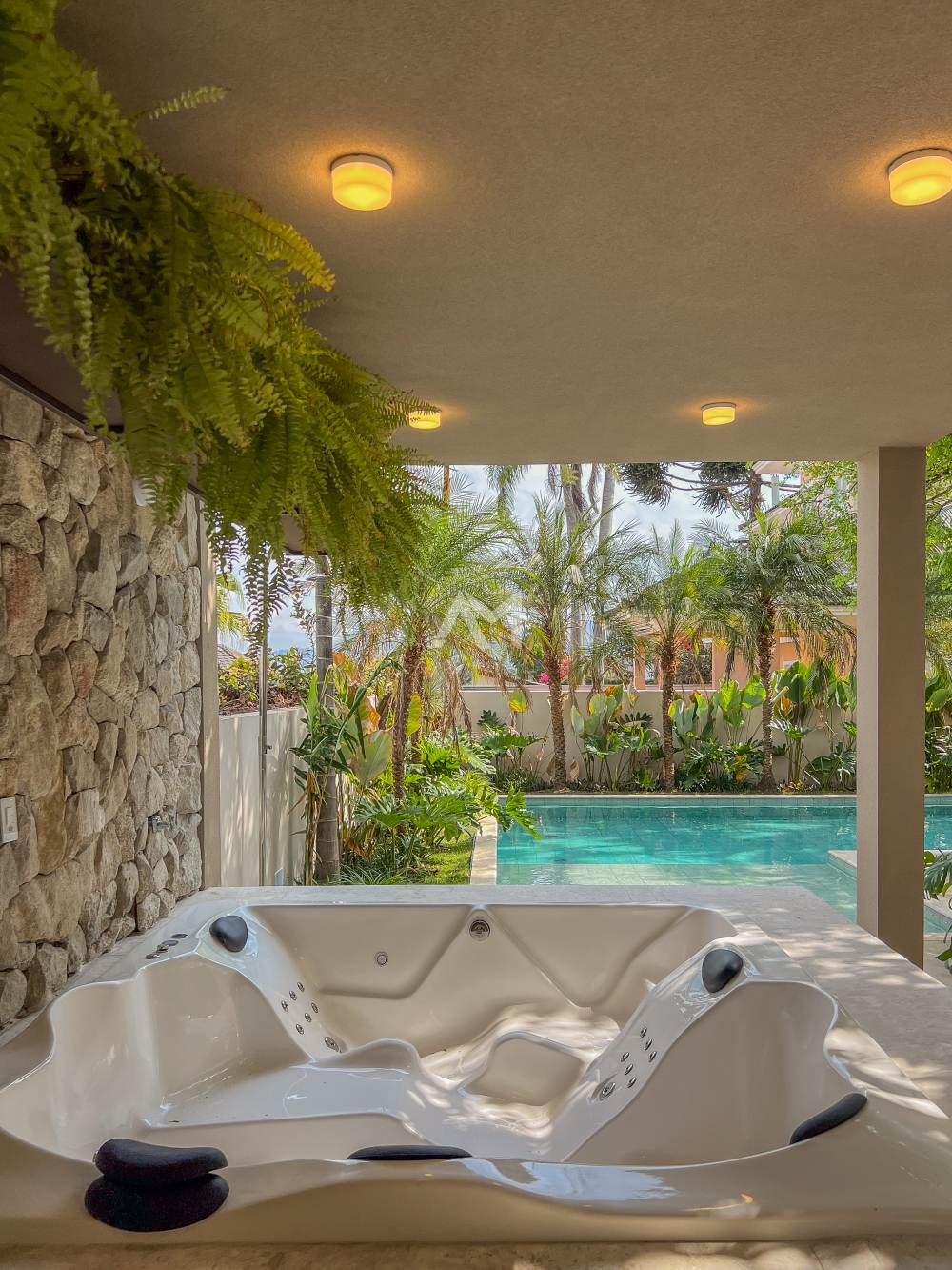 Piscina ampla com prainha, perfeita para relaxamento e convívio social, SPA exclusivo , revestido com pedras moledo, com jacuzzi para até 7 pessoas