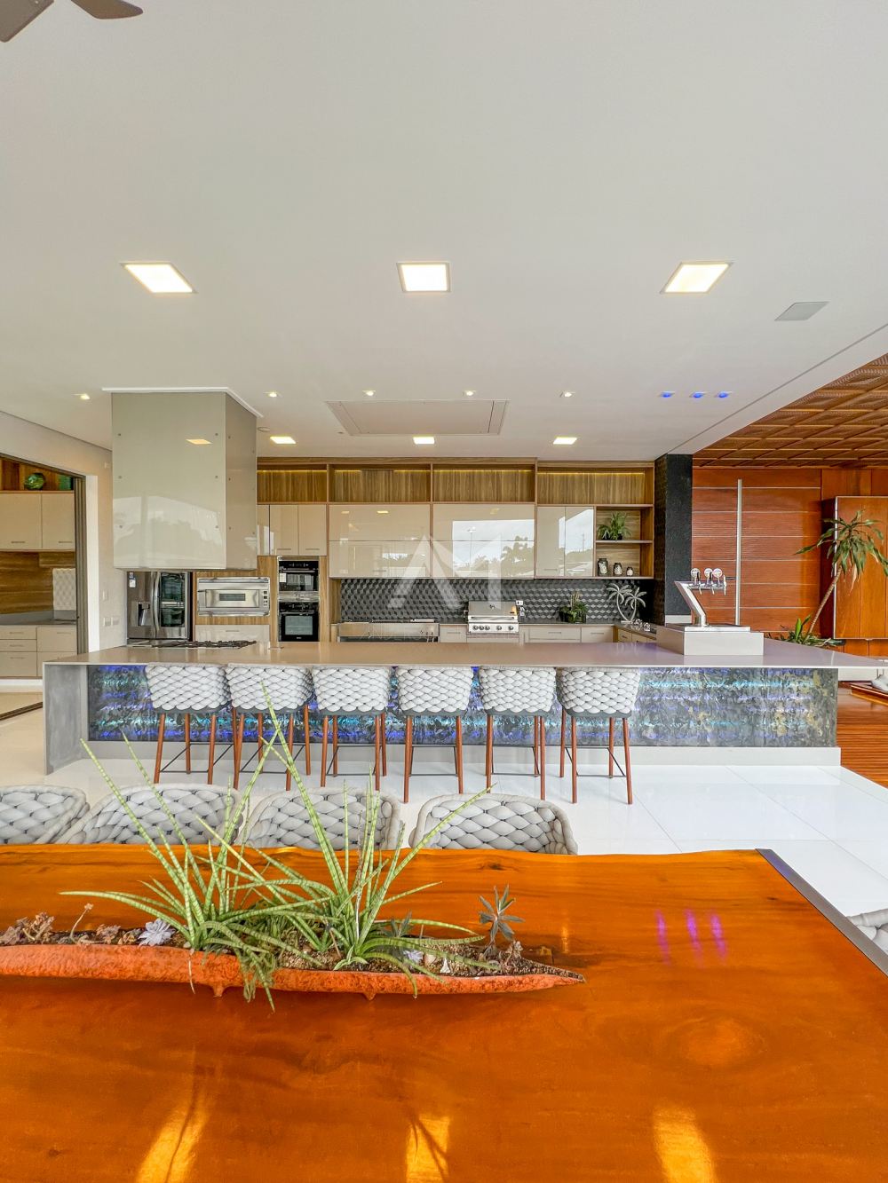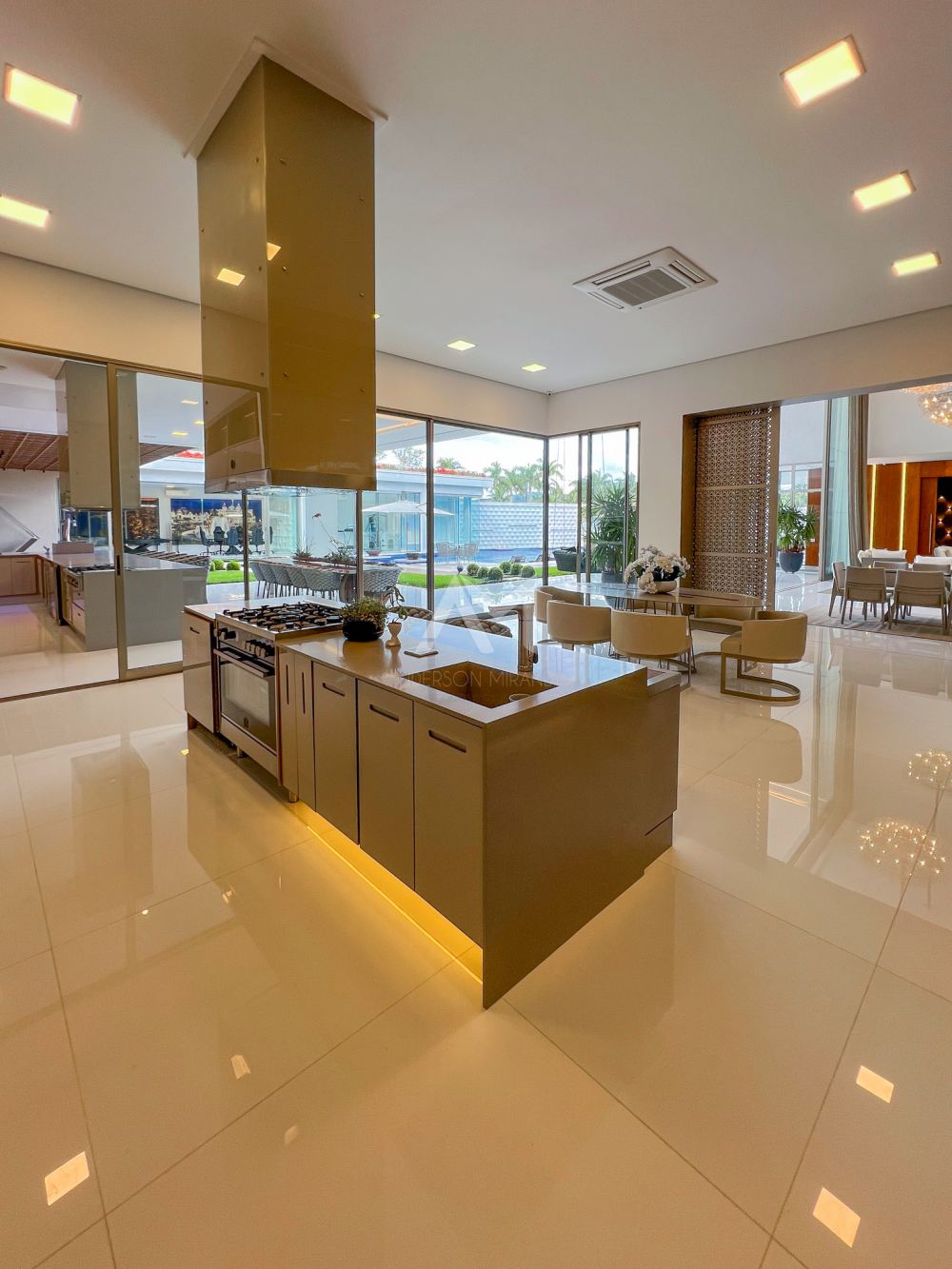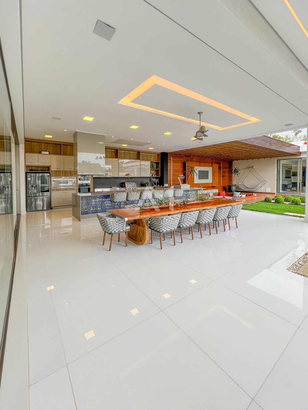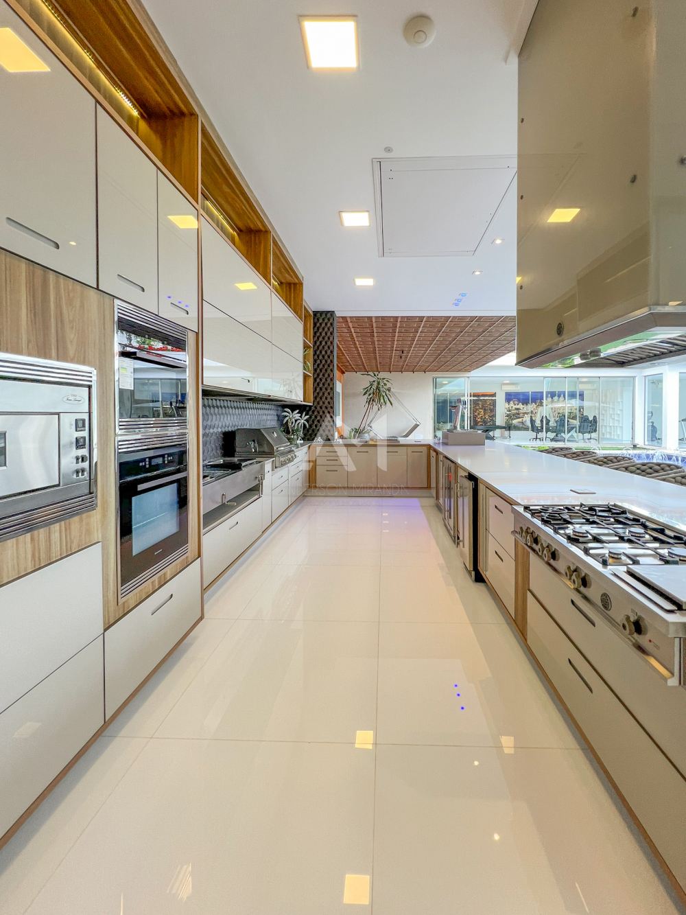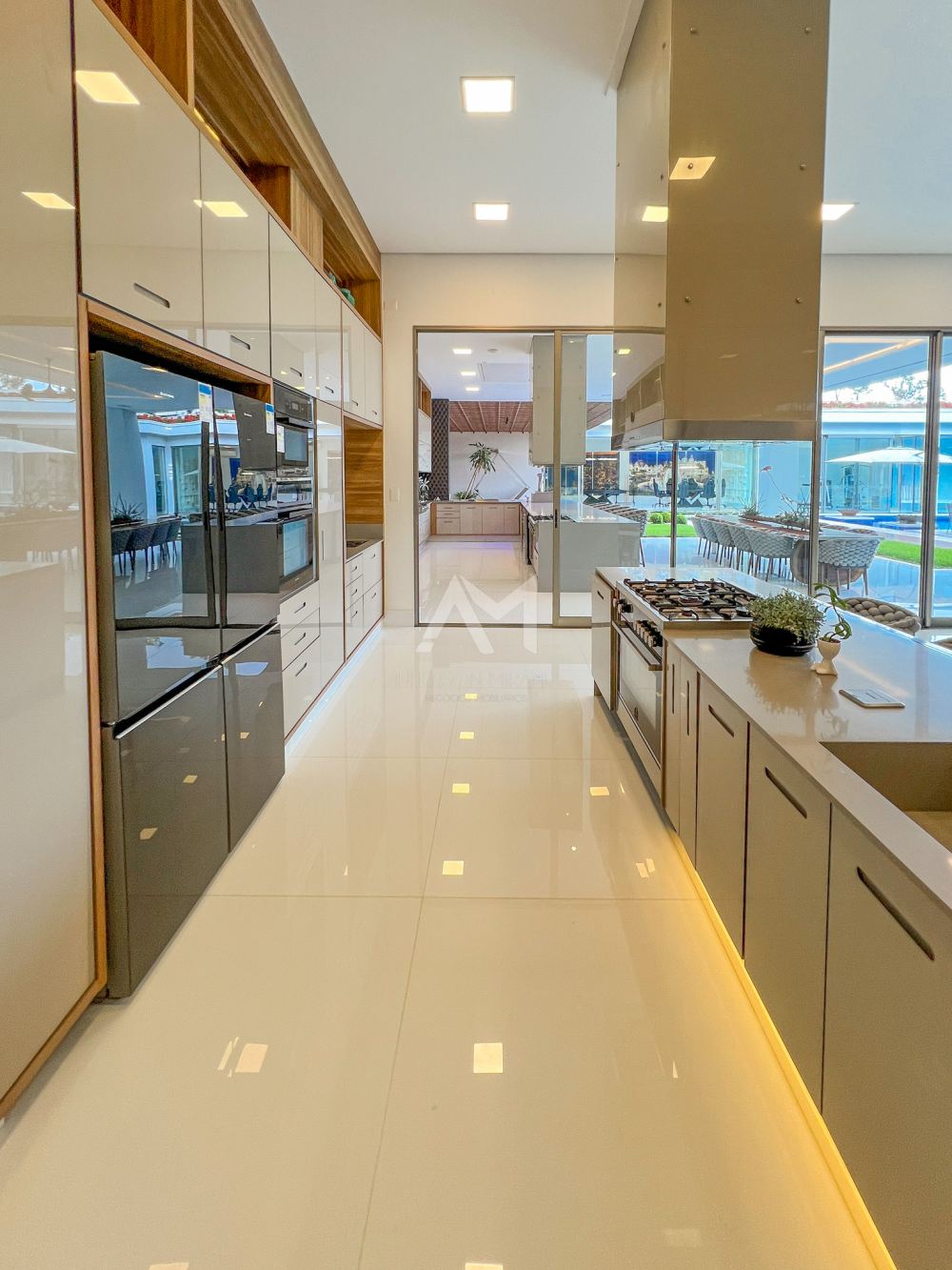 A cozinha, uma verdadeira obra de arte funcional, é equipada com armários planejados em acabamento glossy e aparelhos de última geração das marcas Bertazzoni e Elettromec. E com portas deslizantes que se abrem para um espaço gourmet igualmente sofisticado, você terá o cenário perfeito para celebrações inesquecíveis.