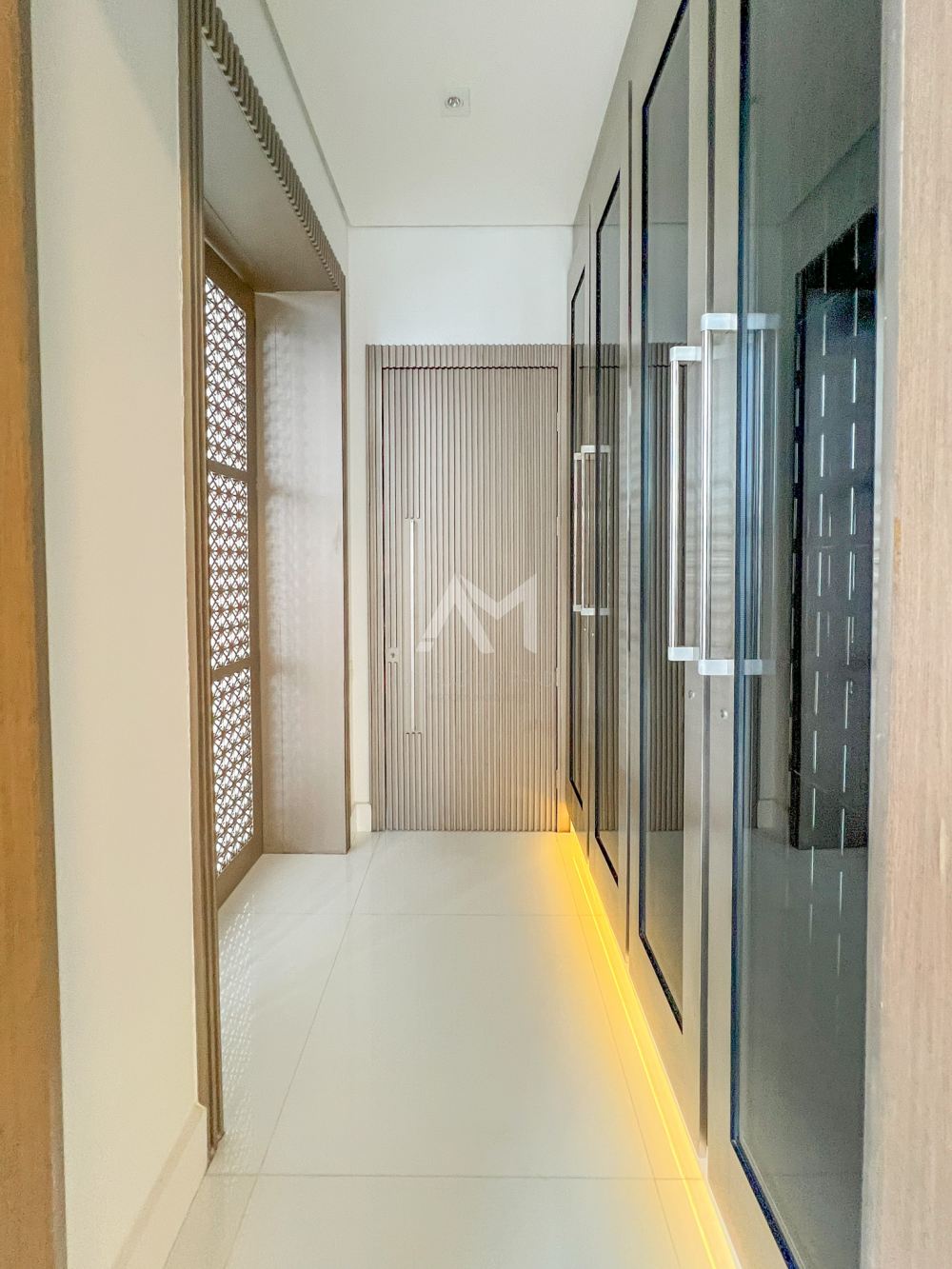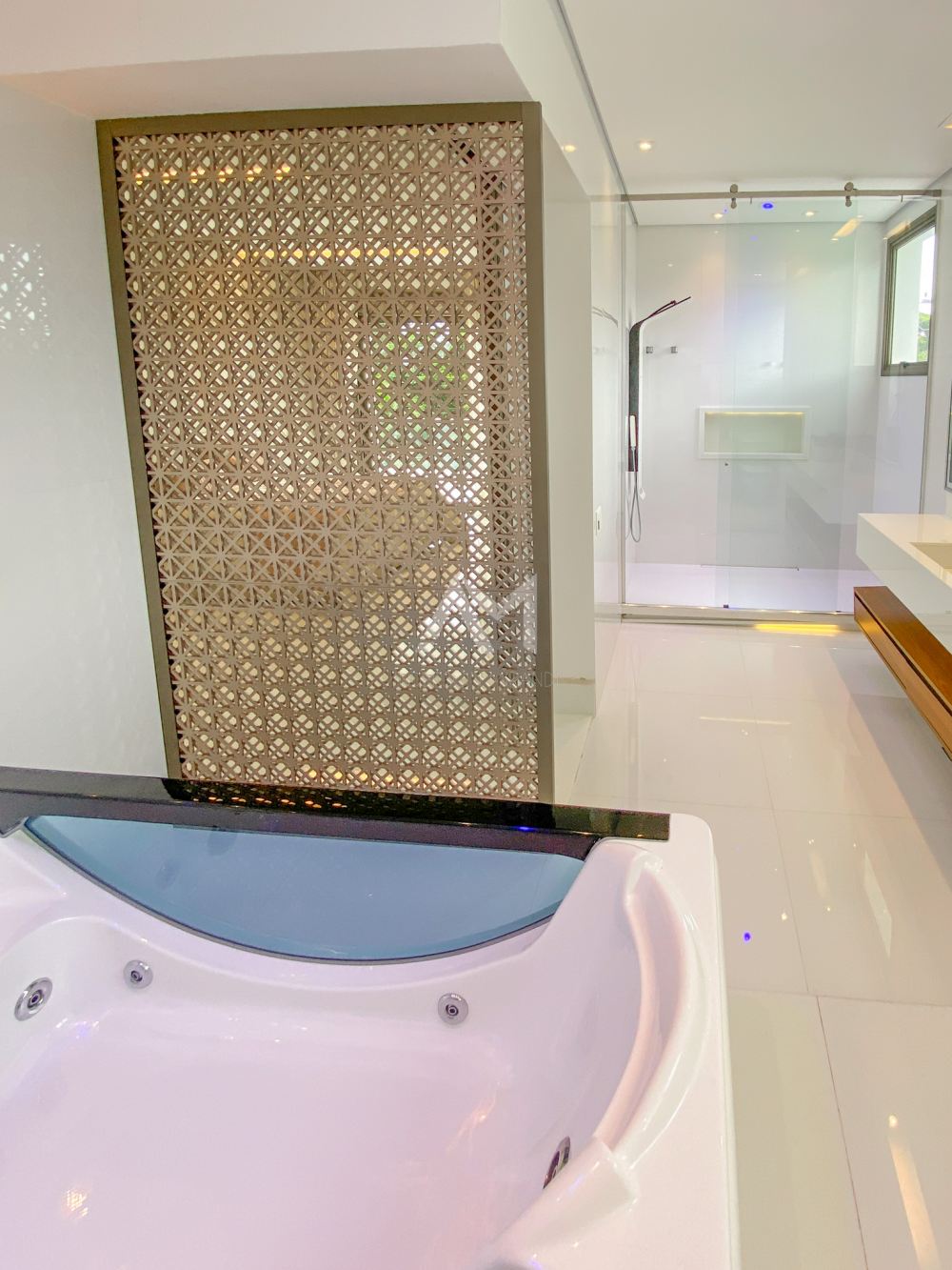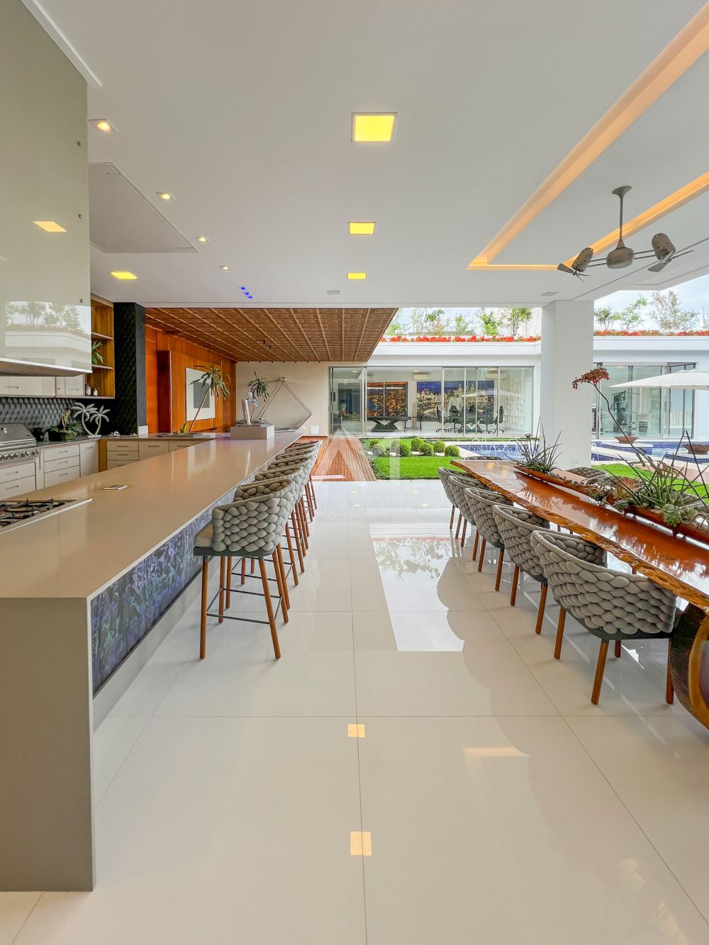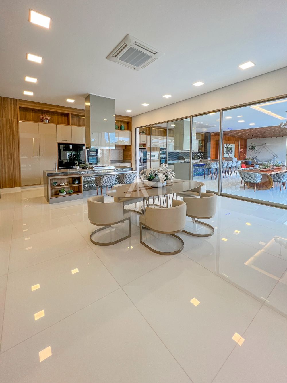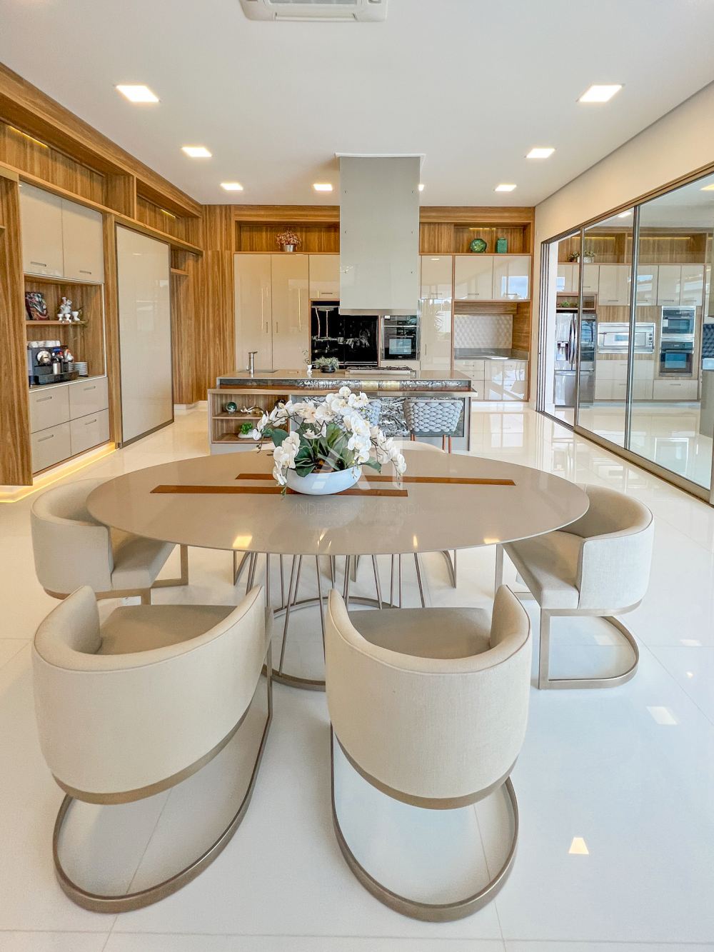 Mas o luxo não termina aí. Os painéis muxarabis em madeira, um toque de arquitetura árabe, dividem com sofisticação a sala de jantar e a cozinha. Imagine convidar seus amigos e familiares para um jantar elegante, com até doze pessoas sentadas confortavelmente ao redor de uma mesa com tampo de vidro.