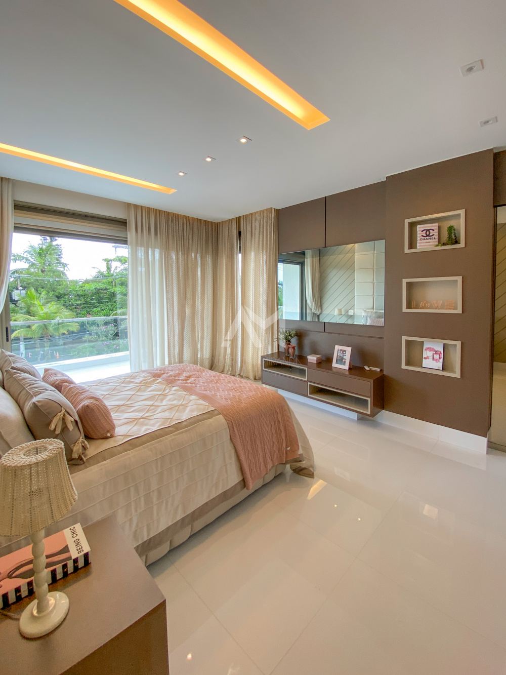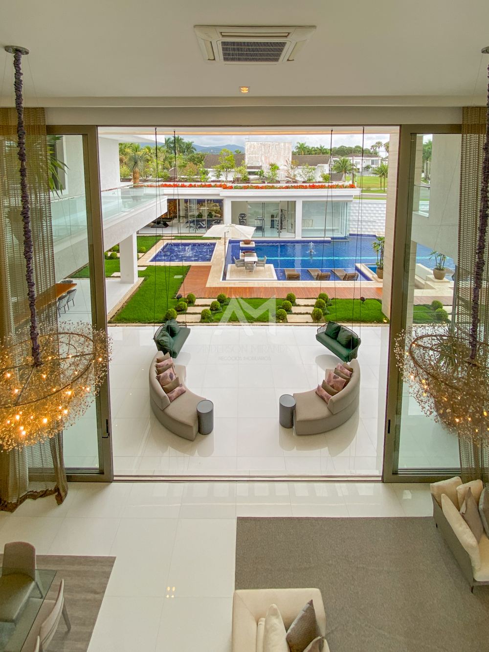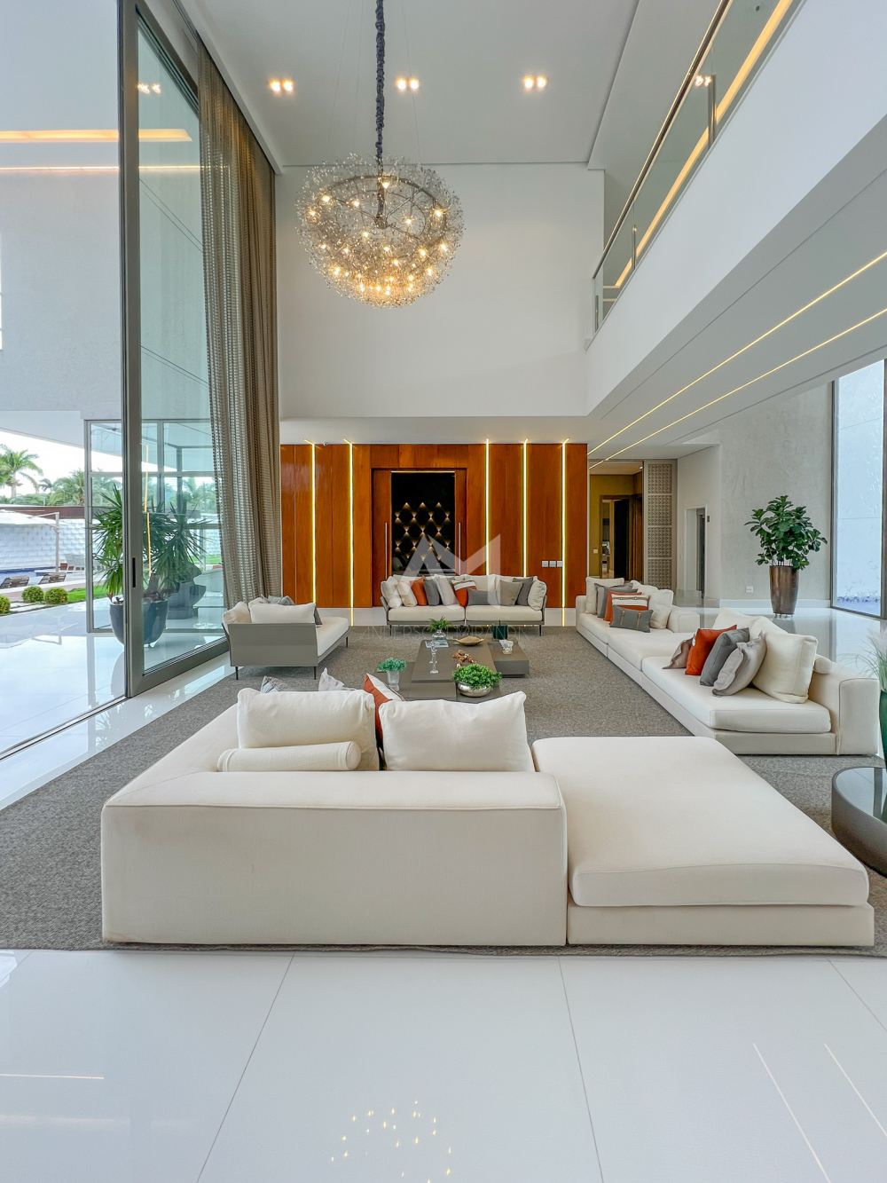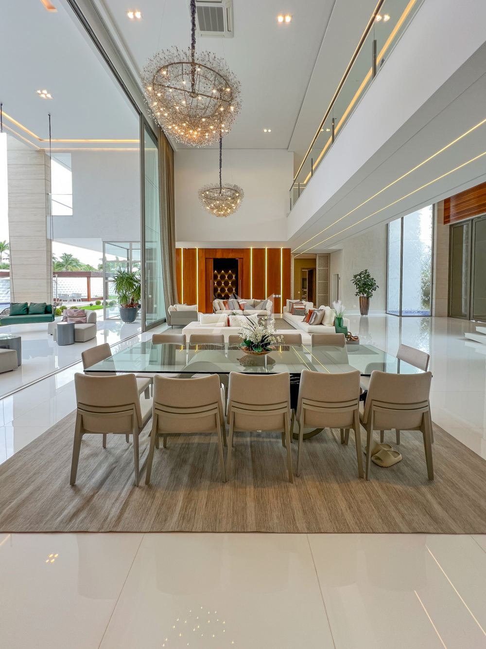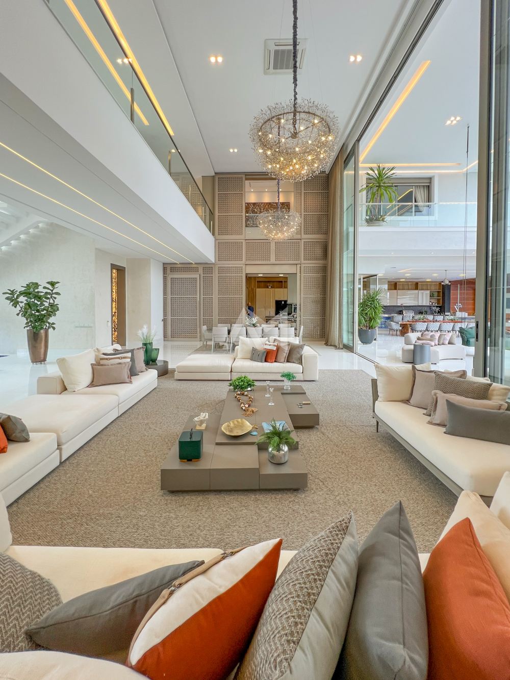 Ao entrar, você será recebido por um espetacular pé-direito duplo, ornamentado com cortinas em voil que dançam ao sabor do vento e lustres de cristais Swarovski feitos à mão, que espalham um brilho mágico por toda a sala.