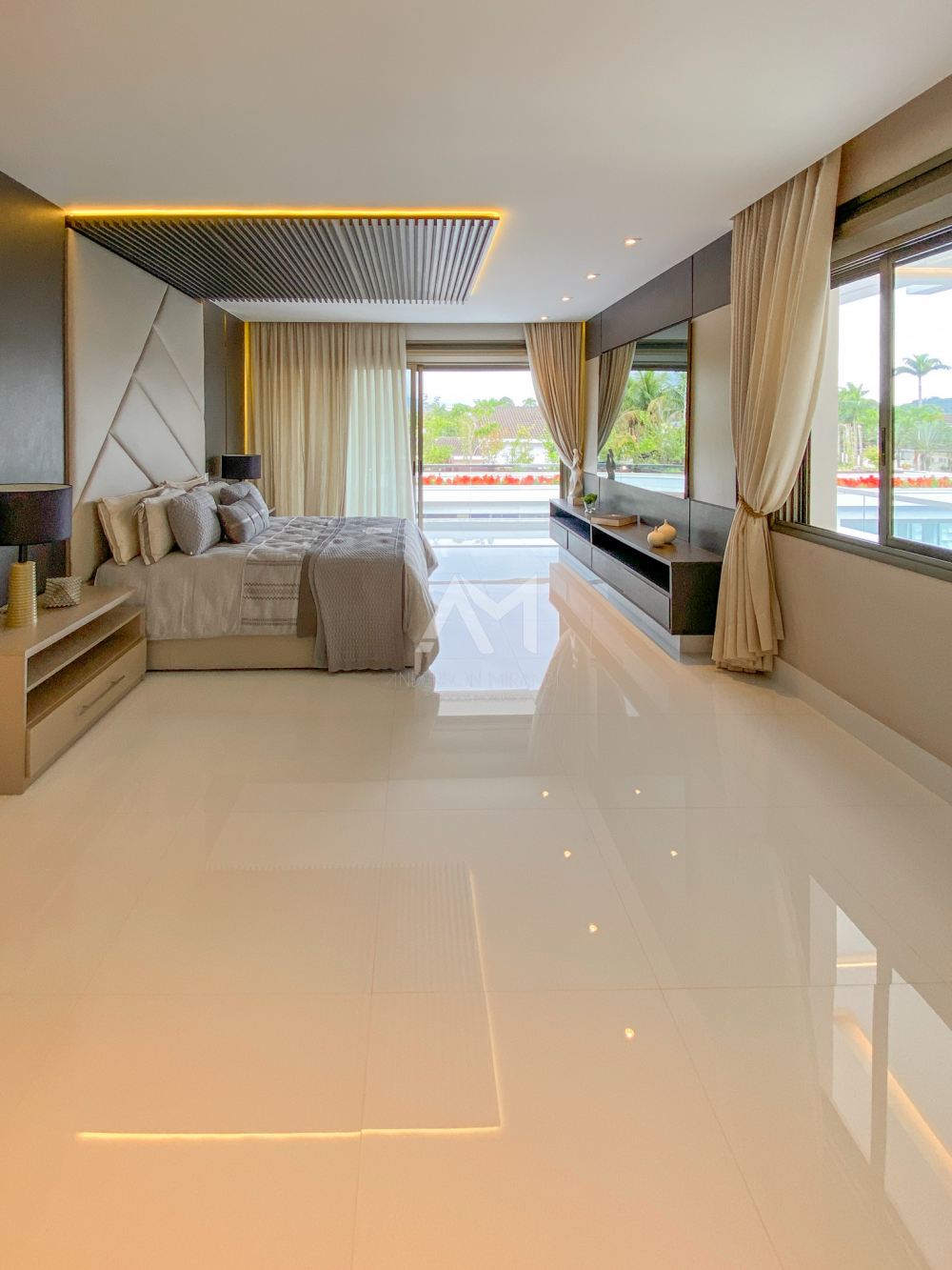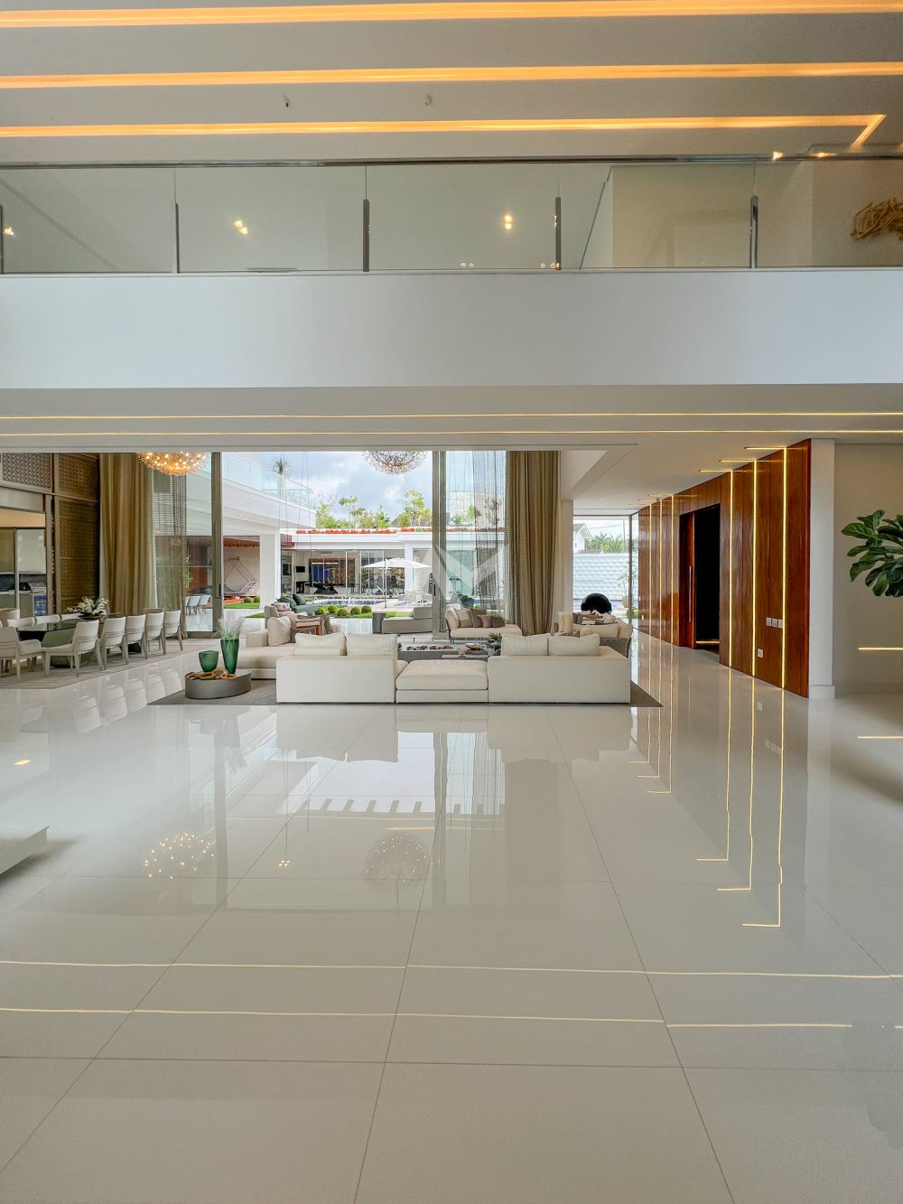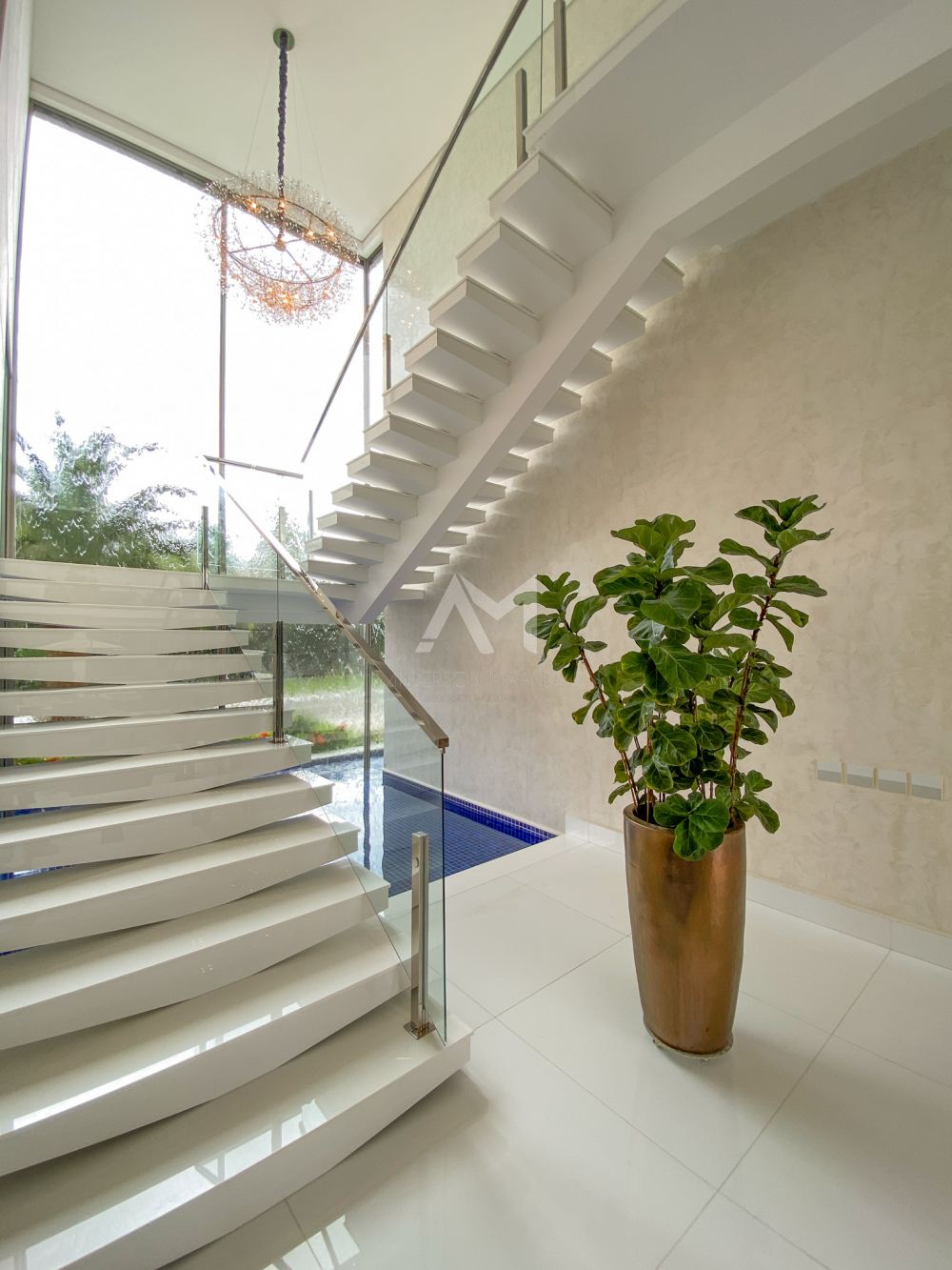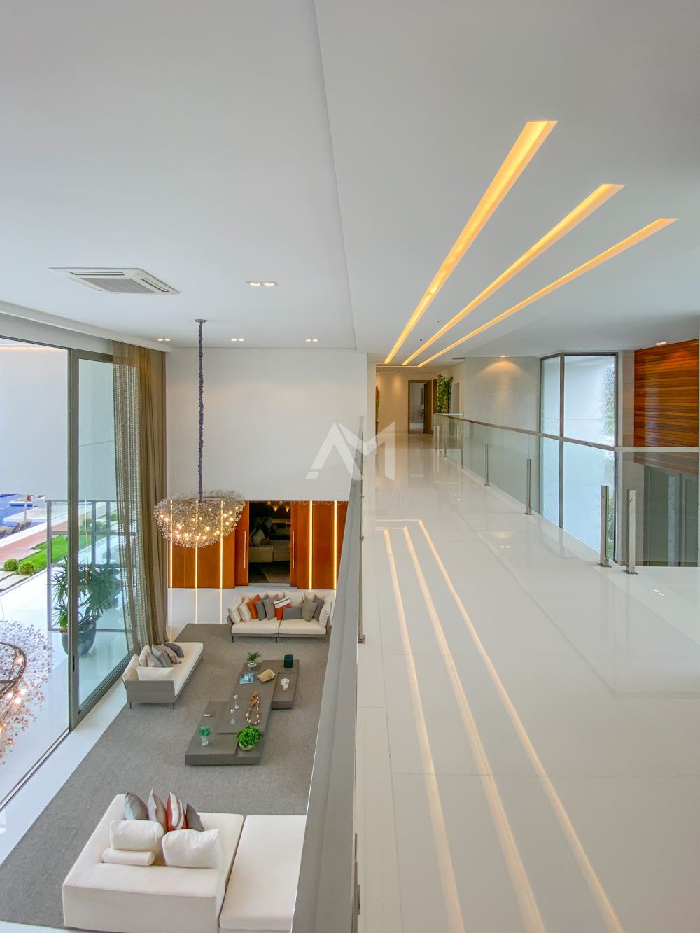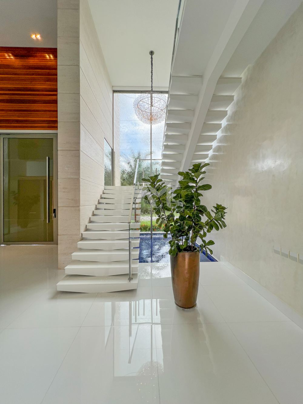 Ao entrar, você será recebido por um espetacular pé-direito duplo, ornamentado com cortinas em voil que dançam ao sabor do vento e lustres de cristais Swarovski feitos à mão, que espalham um brilho mágico por toda a sala.