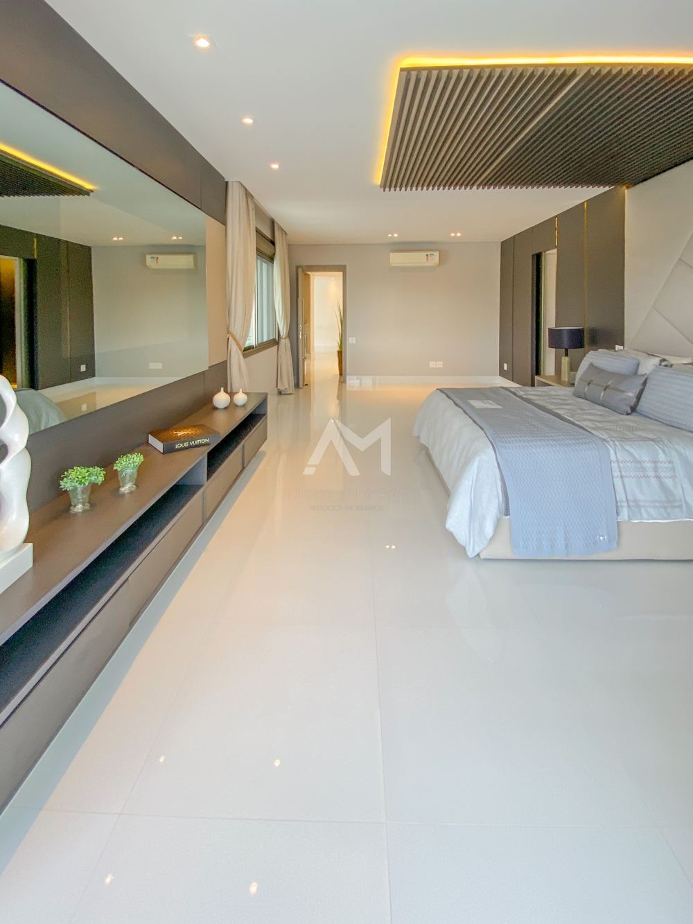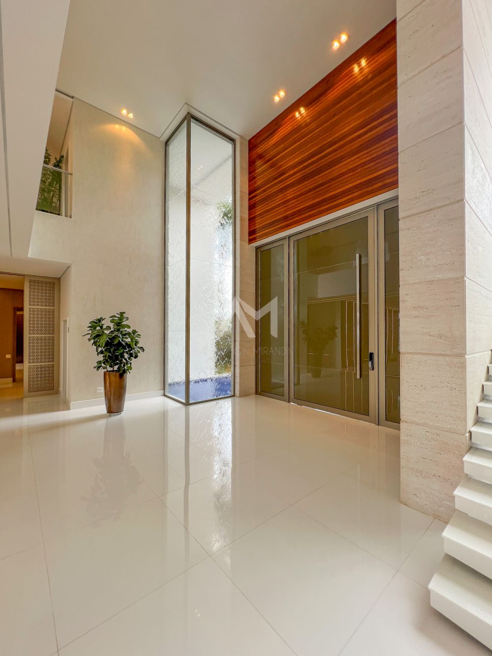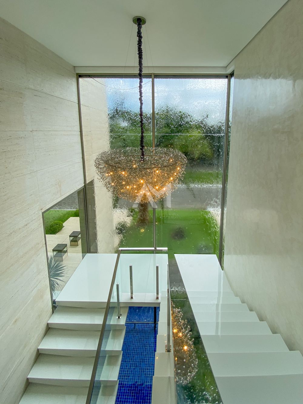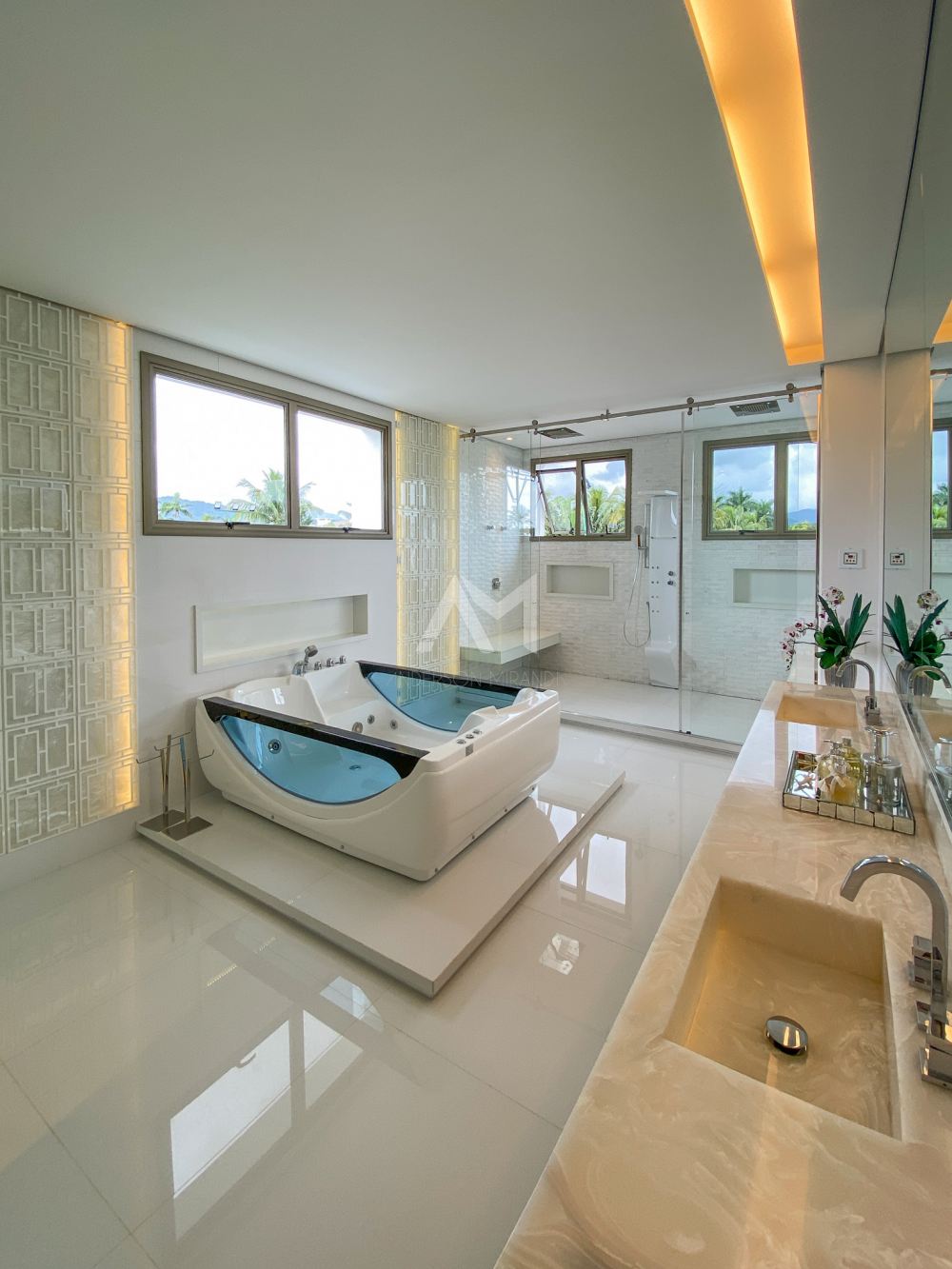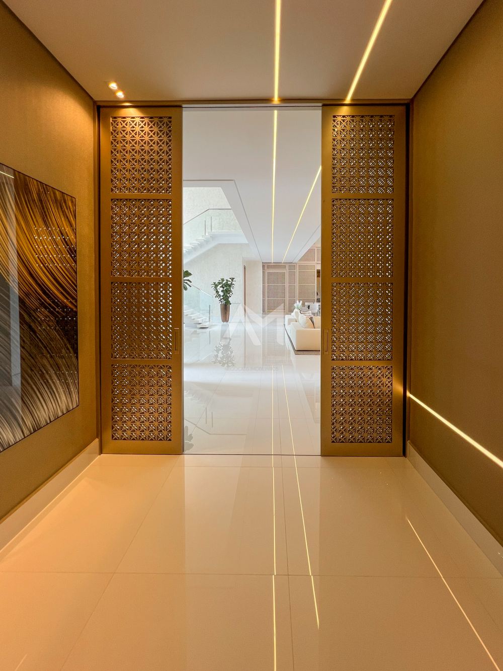 Ao entrar, você será recebido por um espetacular pé-direito duplo, ornamentado com cortinas em voil que dançam ao sabor do vento e lustres de cristais Swarovski feitos à mão, que espalham um brilho mágico por toda a sala.